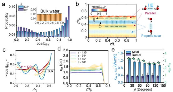 限域水分子的热力学行为统计揭示了纳米限域水热导率的提升机制——氢键旋转。在纳米限域水中,朝向与纳流道平行的氢键数量明显增多。相反,宏观块体水中的氢键朝向并无显著偏好。计算结果进一步显示,相互作用最强的固液界面处,大多数氢键与纳流道同向,而其余氢键形成了五层分布,每层氢键相互垂直。在固液相互作用增强的情况下,水分子的转动被加以限制,使得氢键的多层网络构型进一步稳定。该特殊构型使得平行于纳流道方向的热导率增加,但破坏了垂直于纳流道方向的氢键网络与热通路,导致纳米限域水的热导率呈现各向异性。