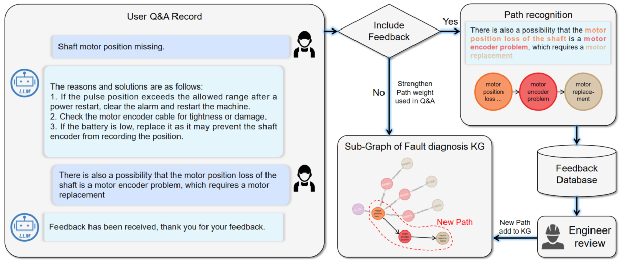 基于知识图谱的RAG方法融合了多源异构数据,通过将知识图谱划分为多个与特定故障原因关联的解决路径子图,将多轮对话转化为图谱路径的遍历过程,有效弥补了传统RAG在结构化方面的不足,增强了复杂交互任务支持能力。而动态学习机制则通过持续的用户交互,动态更新知识图谱,实现生成能力与诊断性能的协同进化。论文设计了面向垂直领域的大模型评估基准体系,并通过大量对比实验验证了所提出框架在实际工业环境中的应用可行性。目前,该系统已成功部署于华中数控“数控云管家”APP。