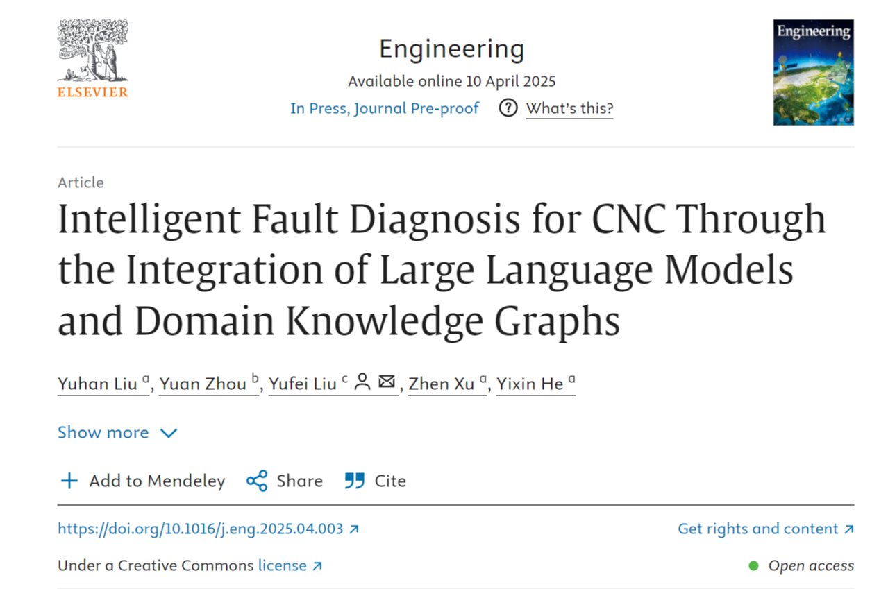 4月22日,英国365公司官网陈吉红教授、杨建中研究员牵头的“智能决策支持”团队在中国工程院院刊/中国科技期刊卓越计划领军期刊《Engineering》(中科院一区, 影响因子10.1)上,发表了题为《Intelligent Fault Diagnosis for CNC Through the Integration of Large Language Models and Domain Knowledge Graphs(集成大型语言模型和领域知识图谱的数控系统智能故障诊断研究)》原创性研究论文。我校国家智能设计与数控技术创新中心、英国365公司官网2021级博士生刘宇涵为第一作者,展现了我校机械、数控系统和人工智能“双一流”交叉学科的最新研究成果。