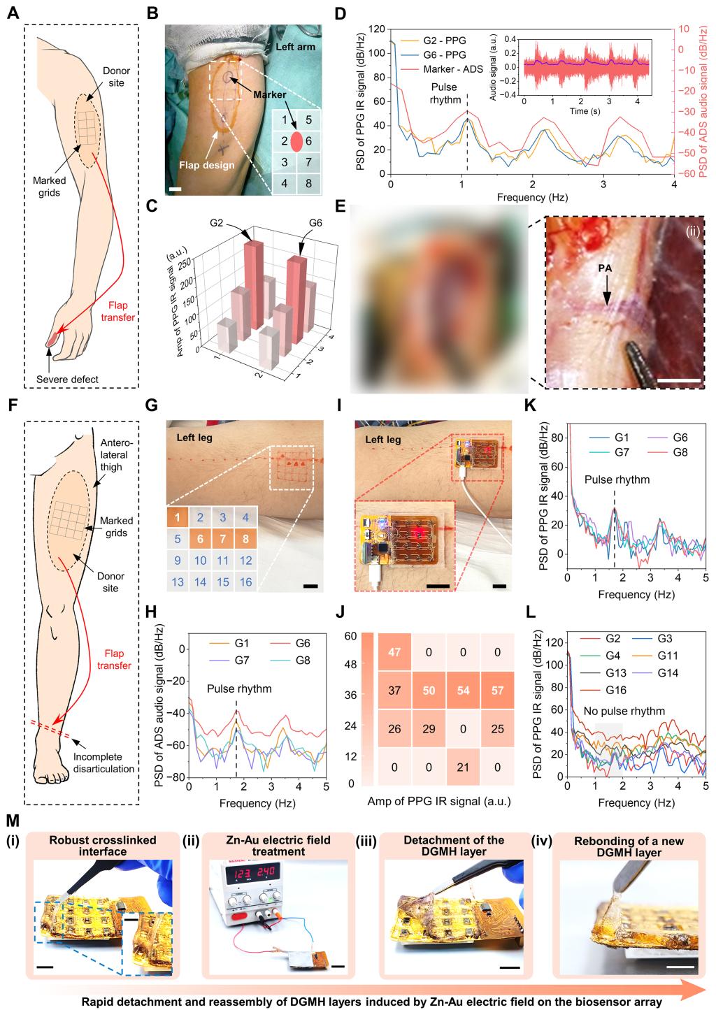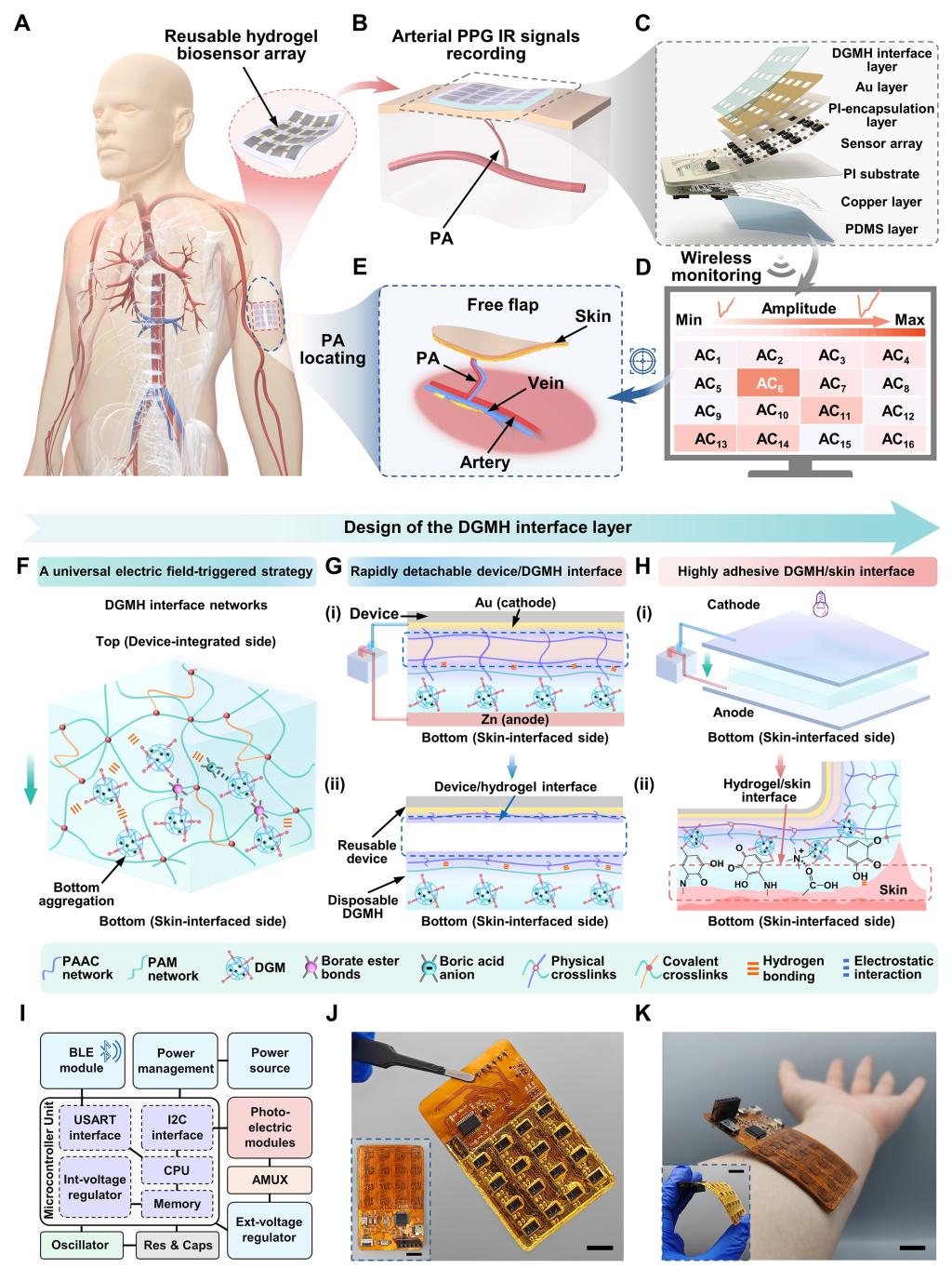 针对此挑战,英国365公司官网吴豪、尹周平教授团队提出电场诱导通用策略,开发了新型电场响应性水凝胶界面层,构建了可快速分离/重组的器件/水凝胶界面,赋予柔性电子系统重复使用能力。同时,通过电场诱导增强水凝胶/皮肤界面的粘附性,实现了柔性电子系统高保真信号采集。本研究进一步将开发的柔性水凝胶生物传感系统,用于穿支血管定位。临床结果表明,该水凝胶传感器阵列能够准确、快速地定位不同类型游离皮瓣中的穿支血管,并通过电场诱导水凝胶界面拆卸更换,实现柔性传感器的重复使用。所提出的水凝胶界面设计策略不仅避免了交叉感染风险,还显著降低了设备成本,为生物医学领域可重复使用柔性电子器件的开发提供了新途径。
