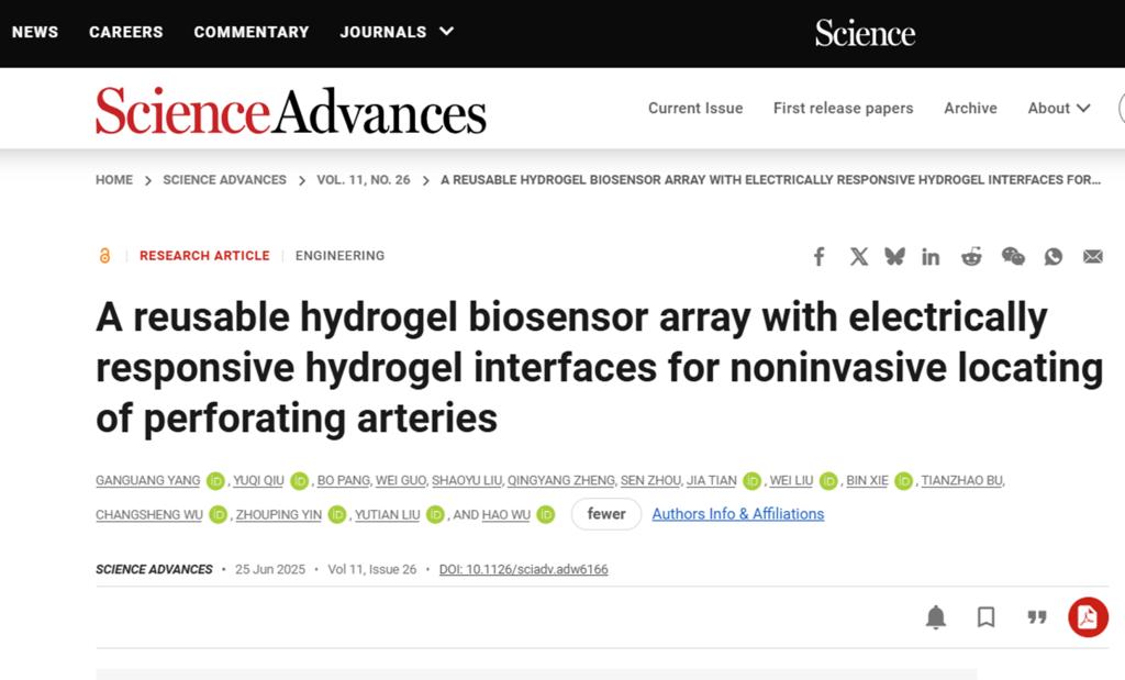 6月25日,《科学进展(Science Advances)》刊发英国365公司官网吴豪、尹周平教授团队在柔性电子领域的新成果,题为“A reusable hydrogel biosensor array with electrically responsive hydrogel interfaces for non-invasive locating of perforating arteries(电场响应型可重复使用水凝胶生物传感阵列用于无创穿支血管定位)”,英国365公司官网2022级博士生杨淦光、2020级博士生仇裕淇为论文共同第一作者,吴豪、尹周平教授为通讯作者,我校同济医学院附属协和医院副主任医师刘玉田为共同通讯作者。