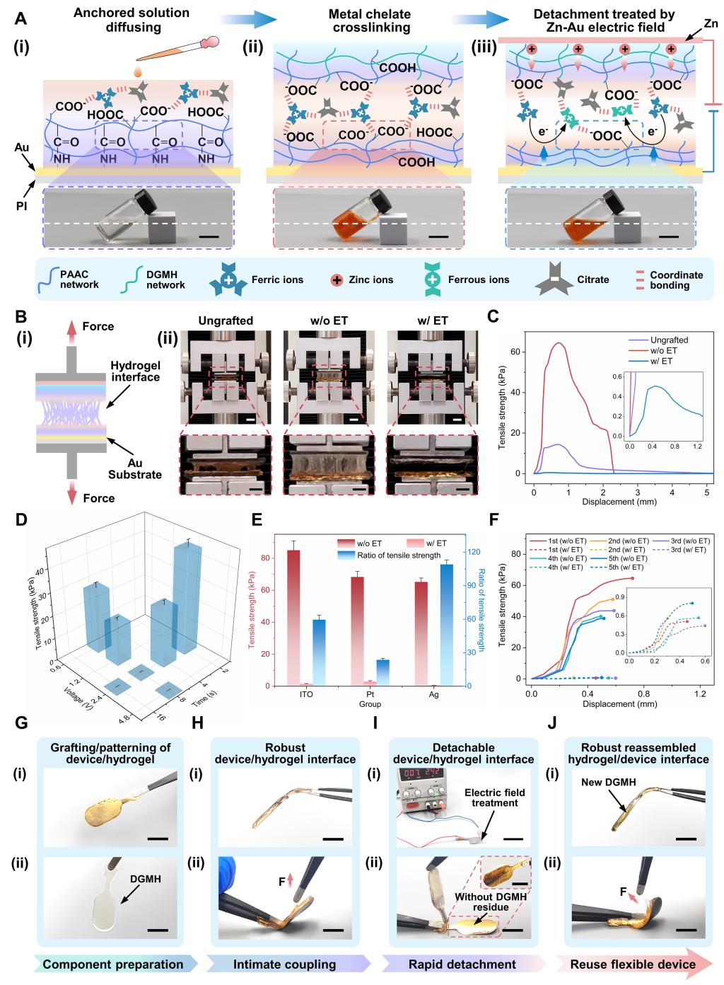 本研究提出了一种电场诱导通用策略来实现可拆卸水凝胶界面设计。水凝胶界面层通过Fe³⁺-羧基配位键与聚丙烯酸(PAAC)修饰的柔性电路基底紧密键合。通过施加电场诱导器件/水凝胶界面网络发生凝胶-溶胶转变,结合强度显著降低117倍,水凝胶界面层完成快速拆卸,并在柔性器件上组装新的水凝胶界面层以实现器件的可重复使用。该通用策略可以扩展到简单的柔性传感器和复杂的柔性电子系统。