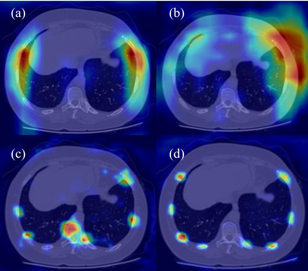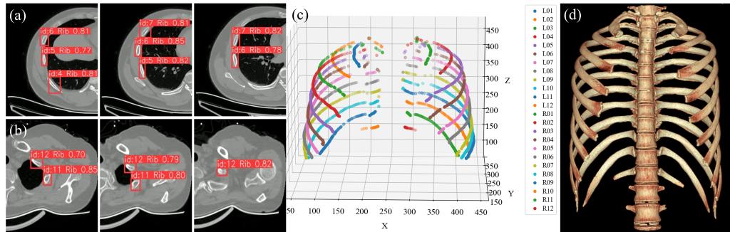 (a) 左侧肋骨追踪检测效果图和 (b) 右侧肋骨追踪检检测效果图 (c) 三维检测点可视化图和 (d) 与检测点对应的三维肋骨图