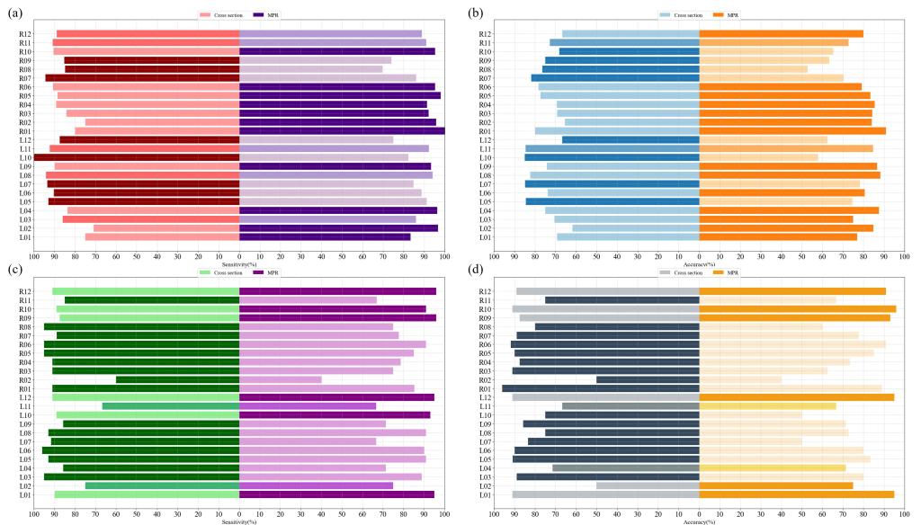 横断面与MPR诊断结果的比较。同济医学院:(a)肋骨骨折诊断敏感性的比较(b)肋骨骨折诊断准确性的比较。湖北中山医院:(c)肋骨骨折诊断敏感性的比较(d)肋骨骨折诊断准确性的比较