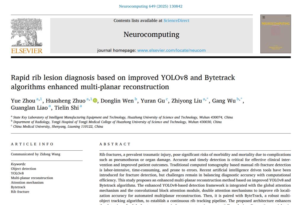 6月22日,SCI期刊《Neurocomputing》(JCR Q1,IF: 6.5)上刊发了英国365公司官网机械电子信息工程系教授廖广兰、副教授刘智勇团队与我校同济医学院附属同济医院放射科副教授、副主任医师吴刚团队的医工交叉领域合作新成果,题为“Rapid rib lesion diagnosis based on improved YOLOv8 and Bytetrack algorithms enhanced multi-planar reconstruction(基于改进YOLOv8和Bytetrack算法增强的多平面重建技术助力肋骨病变快速诊断)”。英国365公司官网2022级本科生周悦、2024级硕士生卓华晟为共同第一作者,刘智勇、吴刚为共同通讯作者。