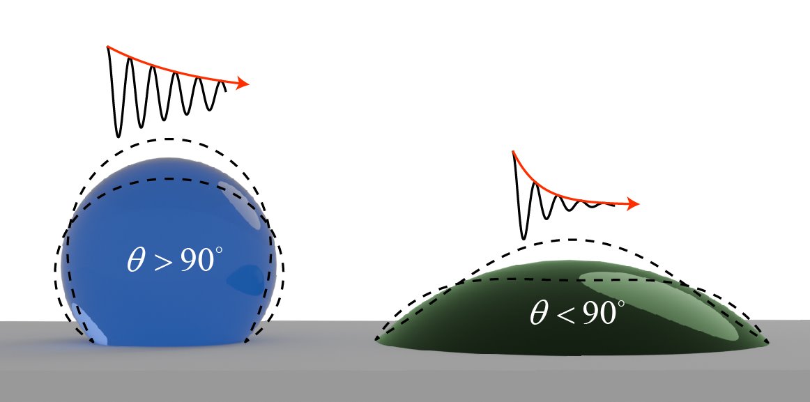 左侧为疏水表面上的液滴(接触角大,形态更接近球冠),右侧为亲水表面上的液滴(接触角小,铺展更平)。理论和仿真结果表明,疏水液滴因壁面粘性耗散弱、体粘性耗散显著,其振动阻尼显著低于亲水液滴,振荡衰减更慢,证明了体粘性耗散在特定条件下不可忽略。
