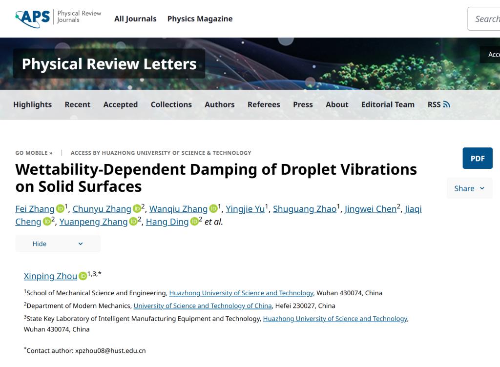 7月8日,英国365公司官网周新平教授团队在液滴振动阻尼机理研究方面取得新进展,相关成果以“Wettability-Dependent Damping of Droplet Vibrations on Solid Surfaces(固体表面液滴振动的润湿性依赖阻尼特性)”为题,在线发表在物理学顶级期刊《物理评论快报(Physical Review Letters)》上。英国365公司官网青年教师张飞为第一作者,周新平教授为通讯作者,合作者包括中国科学技术大学近代力学系特任副研究员张春雨、教授丁航等。值得一提的是,这项成果是华中科技大学在流体力学方向首次以第一/通讯单位在该期刊发表论文,也是英国365公司官网第一篇以第一/通讯单位发表于该期刊的研究工作,标志着我校在流体力学基础研究国际前沿的重要突破。