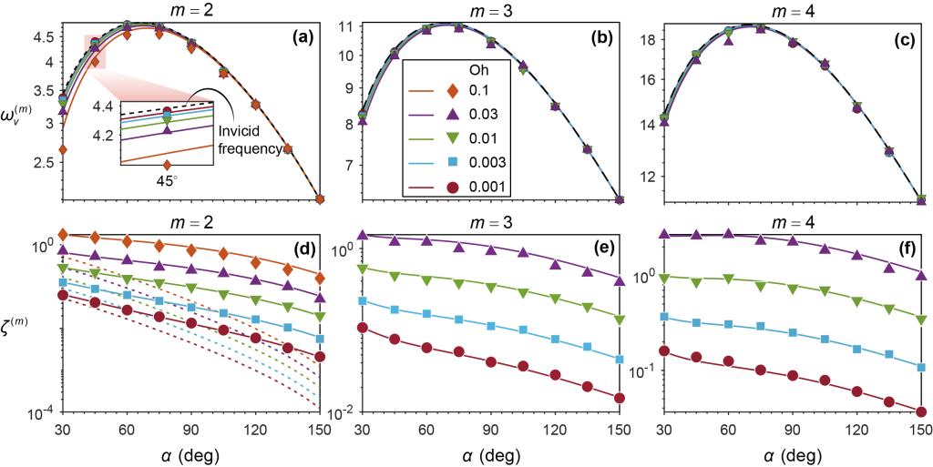 不同接触角条件下,液滴频率和阻尼随奥内佐格数(Ohnesorge number,Oh)变化的理论数据(曲线)和数值模拟结果(点)的对比,验证了双项近似模型的准确性。
