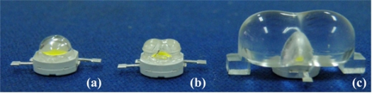 图8(a)传统LED封装器件;(b)ASLP;(c)基于二次透镜用于道路照明的LED模组
