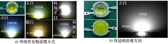 课题组通过分析影响LED空间颜色均匀性的关键因素(如荧光粉形状和位置),研发出基于模具制造和半球形成型的多种新型荧光粉涂覆方法。如图7a,LED色温一般分暖白光、正白光和冷白光,采用传统涂覆技术的冷白光色温差约13000K(18000K-4600K),正白光色温差约5000K,暖白光色温差约1600K,代表国际先进水平的美国科瑞(CREE)公司正白光色温差约1400K;而采用本课题组新型荧光粉涂覆技术的封装模块,色温差仅为600K(图7b),空间颜色均匀性大幅提高,提高了5%(暖白)-40%(冷白),使得安装后的灯具出光从各个角度看的颜色基本一致,光斑饱满均匀,同时光效也提升了2%-5%。