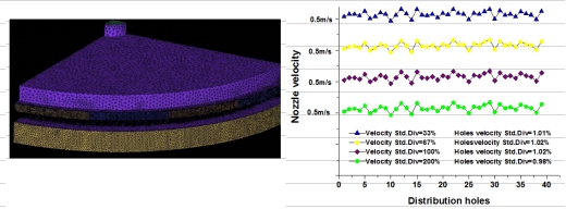 流场的高度均匀性与稳定性对外延生长的均匀性和重复性非常关键,对提高LED外延生长质量,降低生产成本非常重要。BDS反应腔通过水平辐射流与垂直喷淋流相结合,以及缓冲挡板引入, 在提高衬底表面反应源浓度与流场均匀性的同时,使反应腔体在不降低层流均匀性能下具有高度可扩展性,增强了设备稳定性。图2仿真研究了环周进气速度波动对喷嘴速度均匀性影响,从图中可以看出周向流体流动的波动对均匀性影响很小,表明这种新型缓冲分布式喷淋MOCVD反应腔的均匀性与稳定性良好。