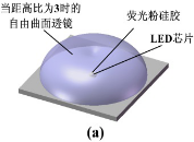 2)直下式背光大尺寸LED平板显示是显示技术的主要发展方向,但是由于传统LED封装器件朗伯型配光的特性,为实现液晶面板的均匀照明,LED之间间距与LED到液晶面板之间的距离之比(距高比)需要接近1,从而导致存在背光腔薄、LED数量多和LED数量少、背光腔厚的困局。针对该难题,课题组提出了一种实现LED均匀照明的逆向设计方法,包括实现大距高比均匀照明的LED配光曲线优化算法以和一种新的实现所需配光曲线的自由曲面逆向设计方法,并发明了面向超大尺寸LED背光应用的新型ASLP(图11)。当距高比为3时,采用传统LED封装器件,面板照度均匀度仅为15.5%,而采用ASLP后照度均匀度增加到88.7%,提升472.2%。虽然单颗ASLP的功耗增大,但LED数量减少为1/9,因此背光系统总功耗也仅为原来的1/4到1/3。
