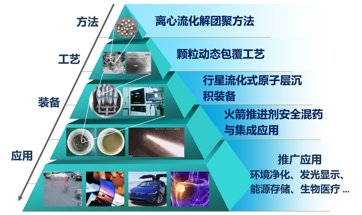 成果累计申请发明专利51项,授权33项(欧盟1项,PCT 2项),自2018年以来发表SCI论文36篇,其中入选Chem. Mater.和Nanoscale封面论文2篇。整体技术达到了国际领先水平,支撑了2018年湖北省技术发明一等奖,研发的原子层沉积装备荣获第44届日内瓦发明金奖。成果受到包括Stanford、Argonne国家实验室等机构,美国、德国、加拿大等多国院士高度评价:“发展的流化装备与工艺对粉体原子层沉积不可或缺”,“获得的核壳结构具有高精度可控性”等。满足新一代推进剂需求,实现了我国推进剂从“跟跑”向“领跑”的转变。在环境净化、发光显示、能源存储、生物医疗等国民经济主战场应用领域取得推广,社会经济效益显著。