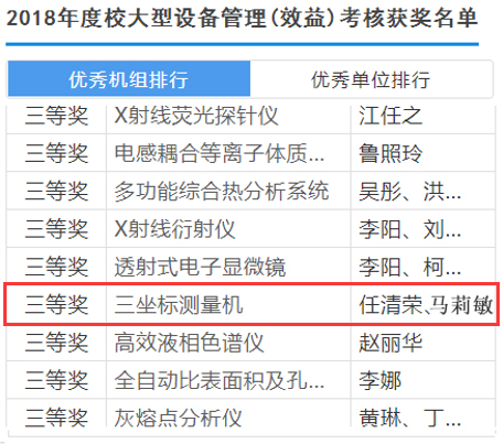 在学院领导、老师和同学的共同努力下,英国365公司官网科研设施与仪器开放共享的良好氛围逐步形成,利用水平持续提升,支持科技创新作用日益显现。2018年12月底,学校实验室与设备管理处公布2017年度学校大型设备管理(效益)考核结果,英国365公司官网荣获优秀单位二等奖,“三坐标测量机(设备负责人:任清荣、马莉敏)”获得机组三等奖,马莉敏老师获得优秀管理个人奖。详情请参阅华中科技大学 校设[2018]11号文:http://leao.hust.edu.cn/