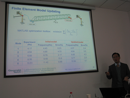 本次报告主要介绍了汪洋教授课题组近年来应用无线传感器在智能土木结构上的两个主要的研究领域及其成果。在结构健康监测领域,无线结构检测系统原型已经研制成功并在众多领域进行了实验验证;在结构控制,其研发的无线传感方法已被用于支持实时反馈控制对地震作用。汪洋教授讲解了无线结构检测系统原型的无线传感单元构成,详细介绍了该系统在广州塔和台湾国家地震研究中心的一些实验结果分析。汪洋教授还介绍了一种基于RFID的应变无线传感器。该装置不需要电池供电,通过接收电磁能量然后反射电磁信号至阅读器,该解决方案已应用于应力集中和结构裂缝的形成。最后汪教授与现场师生就无线传感系统问题进行了深入的互动交流。