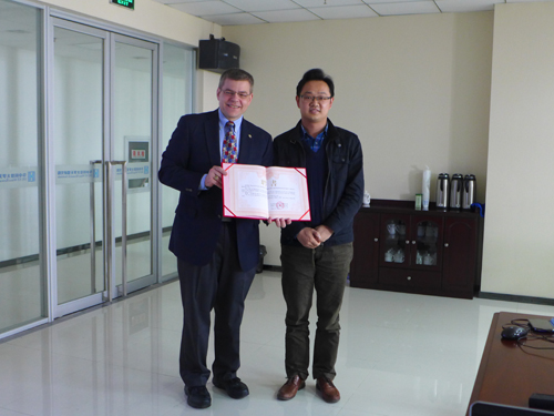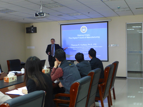 4月23日,Kurfess教授在华中科技大学无锡研究院为相关技术人员和企业代表作了题为“Making Chips, The Digital Future of Manufacturing”报告 ,Kurfess教授指出制造业发展已被确定为奥巴马总统的首要任务,是经济繁荣和国家安全的关键,在2013年和2014年的美国国情咨文讨论中,Kurfess教授就美国政府在先进制造业方面所作出的努力作了阐述,并重点介绍了国家制造业创新网络(NNMI)。讲座结束后,无锡研究院院长助理丁劲锋代表研究院颁发聘书,聘请Kurfess教授担任该院高级顾问,拟定今后共同开展远程科研合作与研究、联合培养人才、共同申报项目等科技服务工作。