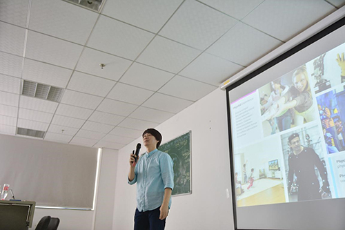 当天下午,在两个半小时的专题讲座中,T J KIM副教授结合个人经历和实际设计项目经验,引导学生如何从过去的经验中探寻未来的用户体验设计。他从策略性设计的程序与方法讲起,分析先进科技和设计之间的关系,指出要分析人潜在的愿望去寻找用户体验设计的方向,先进科技只有应用到设计中才有意义。接着,他把未来的用户体验分成生理化体验、数字化体验、信息化体验、增强现实体验四个方面,并结合可穿戴设备、智能家居、增强现实眼镜等产品设计实例进行了讲解。在讲座最后,T J KIM副教授与同学们展开了互动,详细解答了同学们所提出的问题。