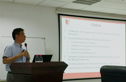 陈教授主要从3D打印时代创新设计的挑战与机遇、基于水平集的形状拓扑优化、基于水平集方法的设计制造一体化、水平集拓扑优化方法的商业化等几个方面作了详细介绍。陈教授首先指出3D打印技术给设计带来了高度自由,传统经验式的设计方法已不能满足面向3D打印的设计方法。拓扑优化技术作为一种优化驱动的设计方法,可实现高性能结构的自动化设计,是一种非常有前景的面向3D打印的设计方法。陈教授向我们介绍了基于水平集的拓扑优化方法在柔性机构、多物理场压电结构、结构超材料和周期性共形超曲面等领域的应用。在此理论基础上,陈教授还开发了面向3D打印的软件工具,可以实现水平集函数直接生成可用于3D打印的STL文件。最后陈教授向我们展示了水平集方法在Altair Hyperworks中的工业应用,还分享了他在Altair公司的工作经验与心得。
