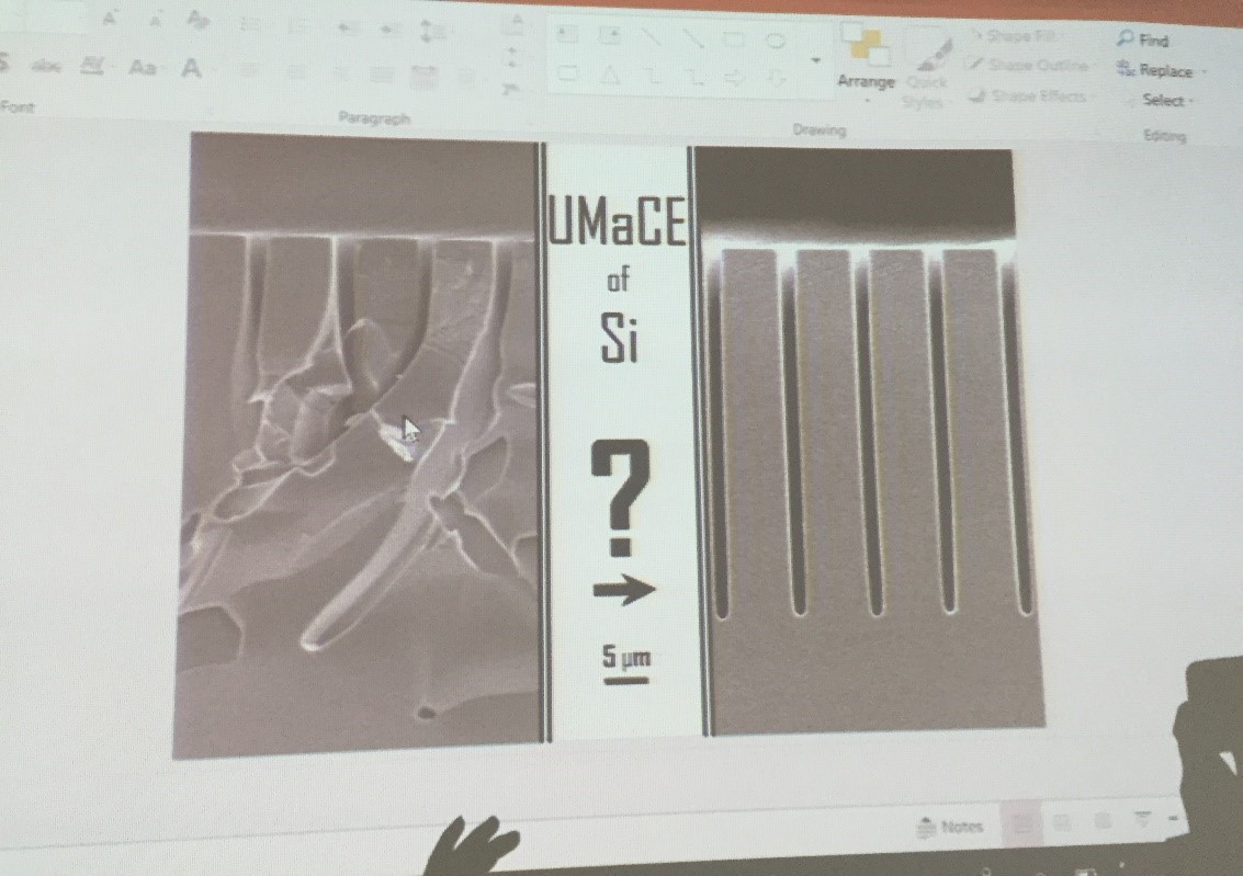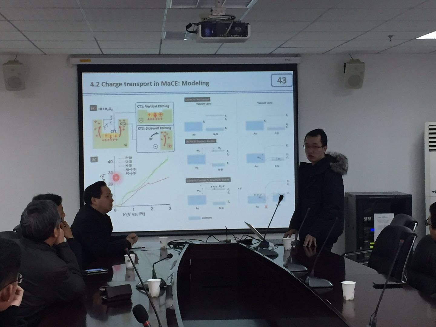 报告中,李博士首先分析了硅片刻蚀技术的发展及现有技术的不足,并介绍了一种新型硅微加工技术-金属辅助化学刻蚀(MaCE),通过制备具有多孔结构的贵金属(如金、银、铂等)薄膜作为催化剂,在电化学作用下,实现了硅片的可控刻蚀(包括位置、方向、速度等,而在此之前,业界普遍认为MaCE技术是不可控的,没有应用价值)。由于MaCE技术具有设备简单,工艺成本低、适合批量生产等特点,可广泛应用于三维封装通孔硅(TSV)结构制备及MEMS器件加工。此外,李博士还介绍了英特尔公司在先进电子封装领域的最新研究成果。