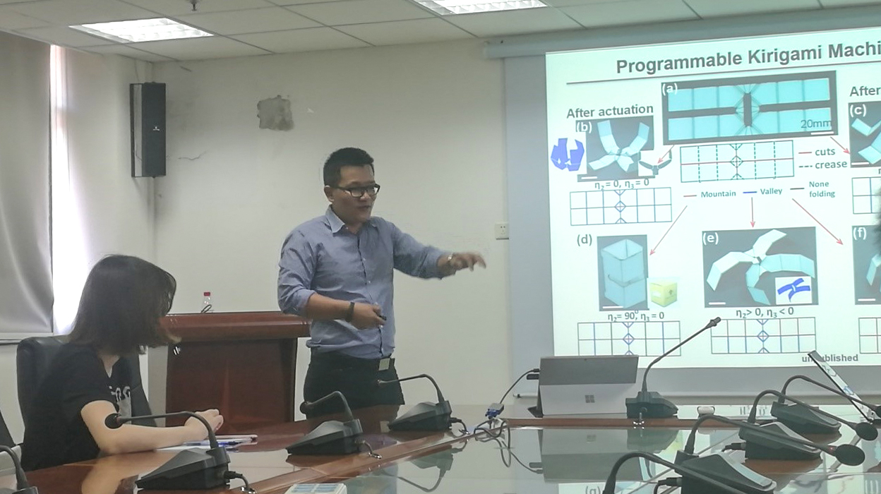 7月19日,应英国365公司官网数字制造装备与技术国家重点实验室肖峻峰老师邀请,来自美国天普大学(Temple University)机械工程系的助理教授尹杰来英国365公司官网交流访问,并作了题为“Deformation Driven Reconfigurable Mechanical Metamaterials and Soft Machines(变形驱动的可重构超材料与软机械)”的报告。