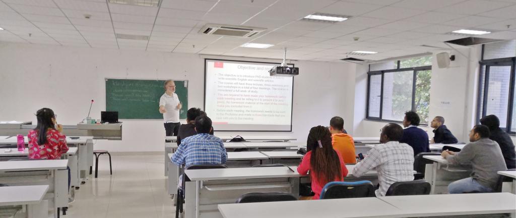 这段短期课程主要是向博士生介绍如何写科学英语和科学文章。课程包括四节课,具体内容为:如何避免剽窃、学术表格及图形的绘制技巧、方法结论及总结、实验讨论。为了提高教学质量,每次授课前,会给学生布置作业和预习任务,并要求学生在下一次上课前将作业上交。在课堂上他精心组织了三次讨论会,两次专题研讨会,鼓励同学们积极讨论和表达观点,激发大家的学习热情。