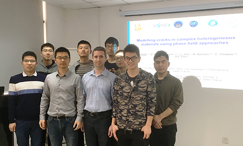 Julien Yvonnet教授首先介绍了其研究团队近年来采用相场法(Phase Field Method)开展的裂隙扩展模拟仿真的相关研究工作,主要阐述了相场法的基于变分的基本理论推导和数值实现,随后介绍了该方法在不同材料及3D裂隙模拟成像中的应用。Yvonnet教授基于相场法裂隙扩展模拟仿真,通过逆问题优化设计有效预测脆性材料的等效表征参数;同时介绍了近期同夏凉副教授课题组合作开展的关于脆性复合材料抗裂性最大化拓扑优化设计的相关研究进展,并对后续的研究合作方向进行了探讨。