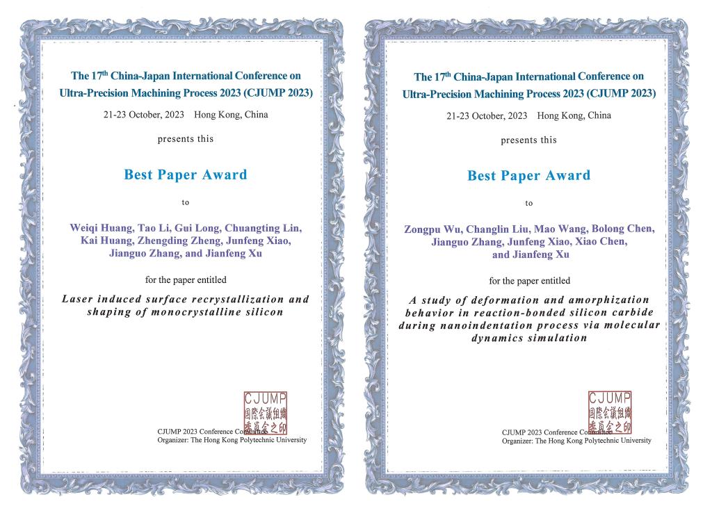 博士生黄惟琦为第一作者的会议论文“Laser induced surface recrystallization and shaping of monocrystalline silicon (激光诱导单晶硅表面再结晶与成形)”、博士生吴宗璞为第一作者的会议论文“A study of deformation and amorphization behavior in reaction-bonded silicon carbide during nanoindentation process via molecular dynamics simulation (反应烧结碳化硅纳米压痕过程变形与非晶化行为分子动力学模拟研究)”获“最佳论文奖(Best Paper Award)”。