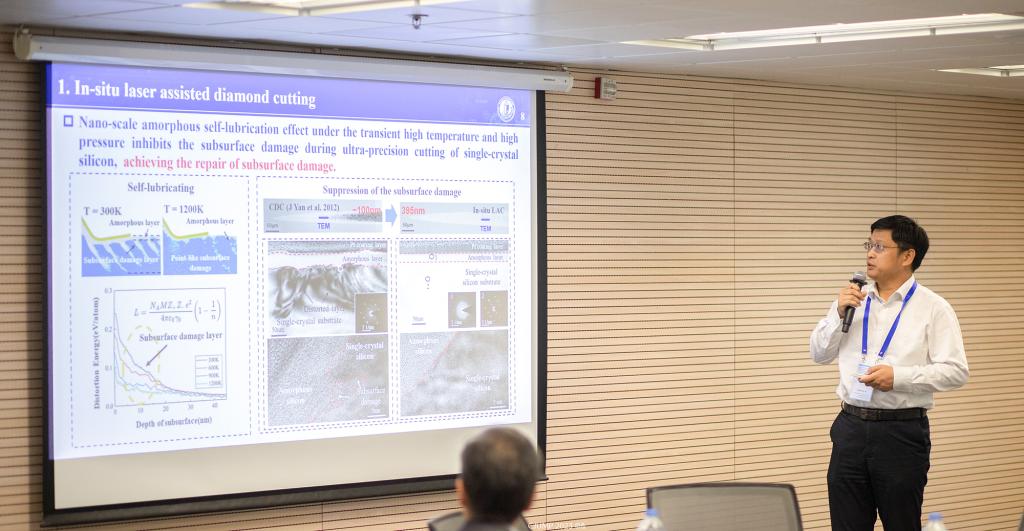 许剑锋作题为“In-suit field assisted ultra-precision machining: theory, technology and equipment (原位能场辅助超精密加工:理论、技术与装备)”的特邀报告。报告从金刚石超精密切削的难点出发,介绍了问题产生的内在机制,阐述了场辅助加工的创新思路,研发原位激光辅助加工、超声振动辅助加工及激光抛光等技术,设计并搭建了场辅助超精密加工设备,实现了多种难加工材料的高精度低损伤加工。
