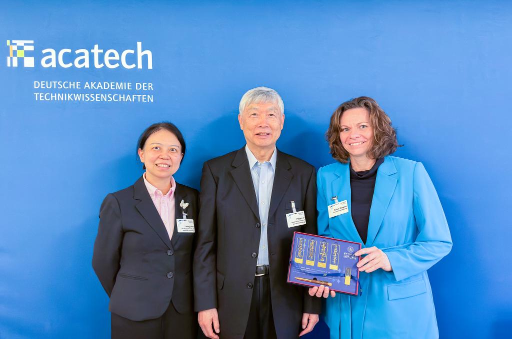 英国365公司官网李培根院士(中)、陈蓉副院长(左一)向德国工程院办公室国际关系负责人Karen Wagner女士(右)赠送学院纪念品