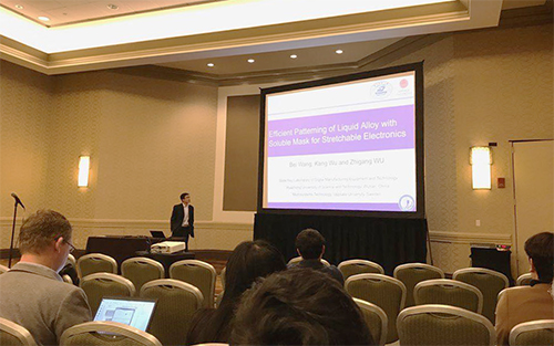 本次会议主题主要包括:生物材料和软材料,电子、磁学和光子学,能源和可持续性,纳米材料,加工和制造,理论、表征和建模等。会议举办了54场研讨会,吸引了6000多名参会人员,吴志刚教授在会议中做了题为“基于可溶性掩模液态金属的可拉伸电子高效成型技术 (Effcient Patterning of Liquid Alloy with Soluble Mask for Stretchable Electronics)”的专题报告。该报告引起了参会者的极大兴趣。