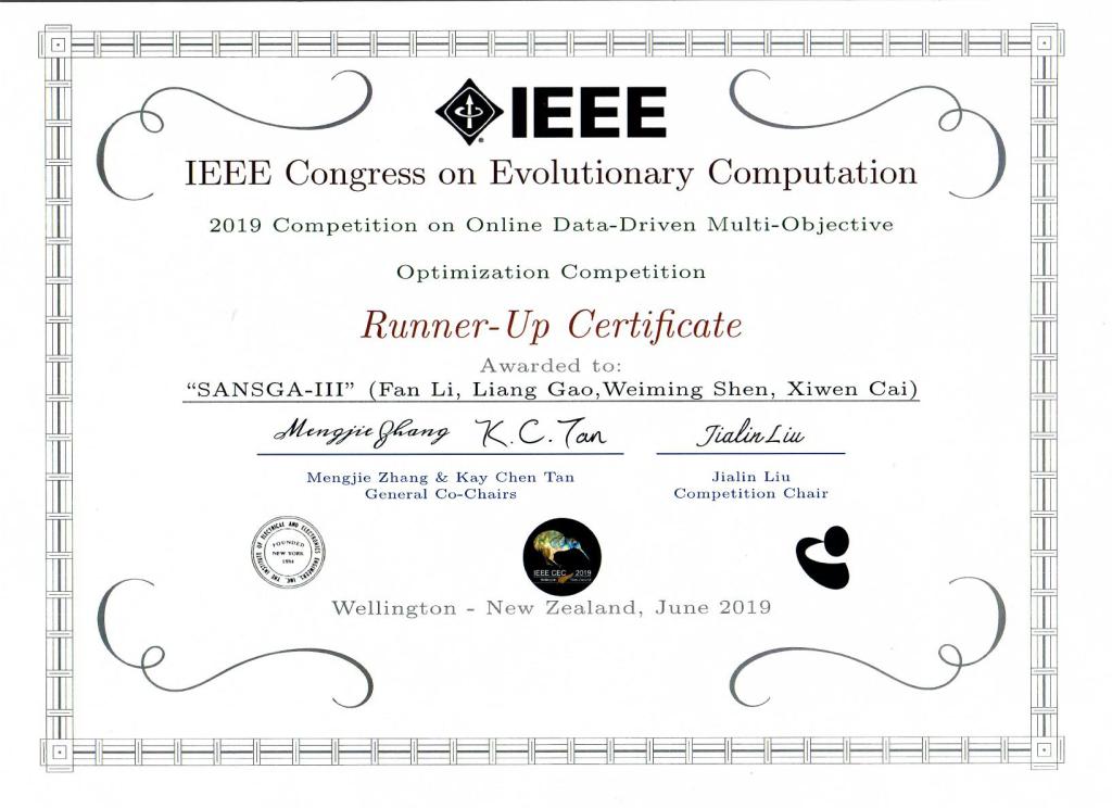 此外,大会还举办了13个以进化算法为主题的竞赛。其中,英国365公司官网团队蔡习文、李帆设计的算法“A surrogate-assisted NSGA-III algorithm for Computationally Expensive Multi/Many-Objective Optimization problems(一种求解计算昂贵多/众目标问题的代理辅助NSGA-III算法)”在“Competition on Online Data-Driven Multi-Objective Optimization(在线数据驱动的多目标进化优化)” 竞赛中获得亚军。