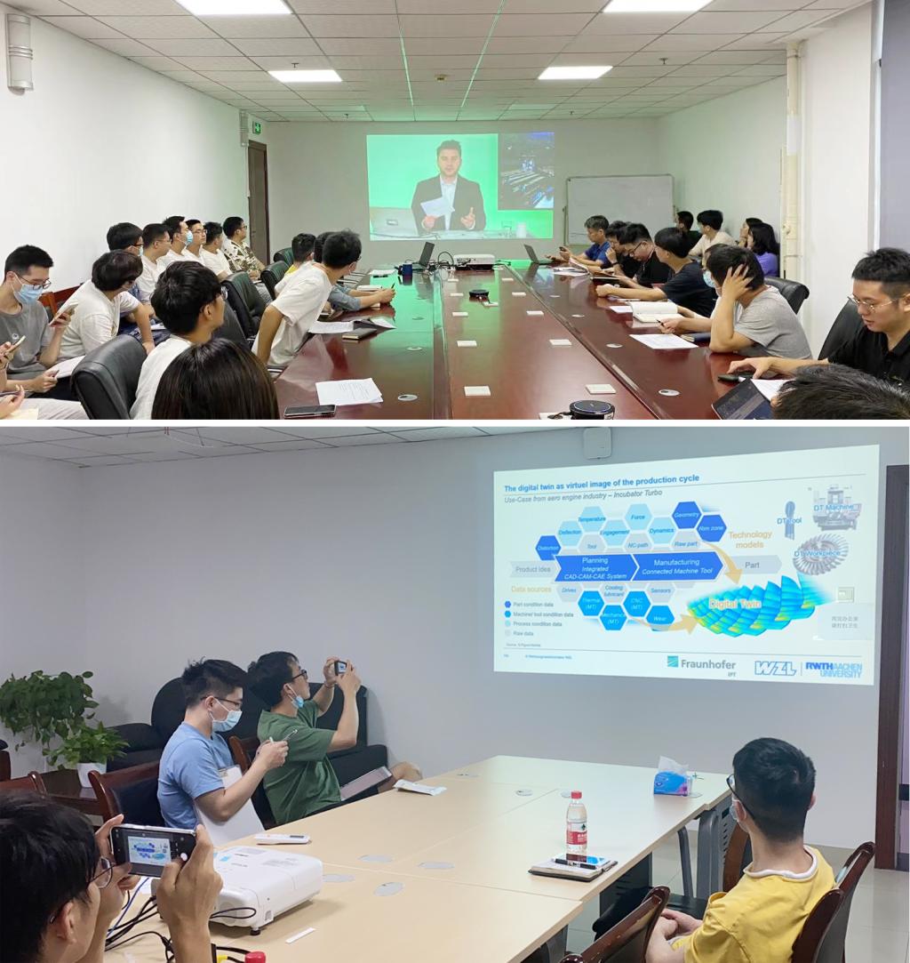 数控中心组织师生线上听取了四大系列主题报告:网络化自适应生产架构、可持续(绿色)生产、制造中的数字孪生、制造过程中的数据分析方法,以及海克斯康、斯瑞福、通快、巴斯福、爱立信等国际知名企业技术负责人带来的精彩演讲。此外,本次会议还提供了“云”参观亚琛工大机床研究所、弗劳恩霍夫制造技术研究所以及亚琛工大科技成果、工业展品,为大家开启了一场多维度、立体化,体验感极强的科技之旅。