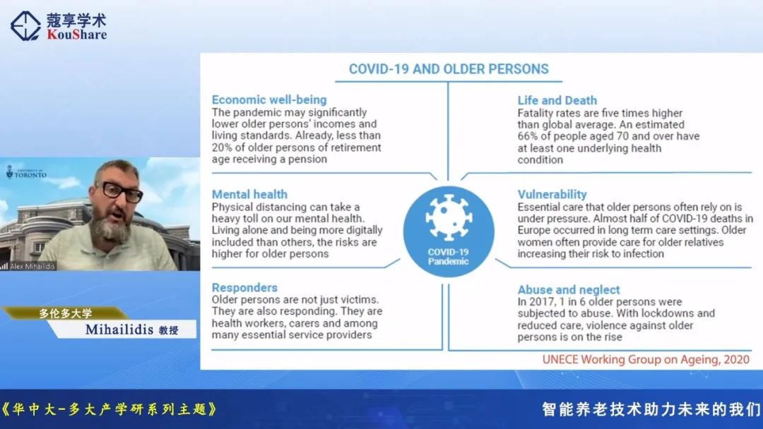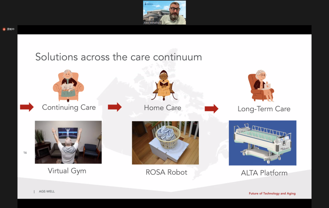 报告中,Mihailidis教授首先介绍了全球老龄化现状,以及疫情冲击下养老服务需求的新变化,指出养老领域需要进行更多的技术投入,也介绍了国际化大公司比如亚马逊、谷歌、Facebook以及BestBuy在养老领域进行了技术投入。