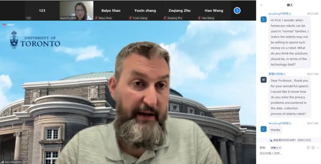 在交流互动环节,Mihailidis教授与线上参会的师生进行了深度交流,从具体的技术问题到养老技术的发展趋势, 他详细地、全面地解答了参会者提出的问题,现场讨论气氛热烈、互动氛围浓郁。