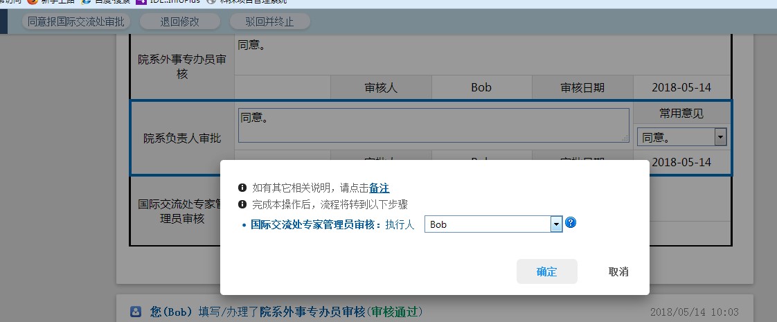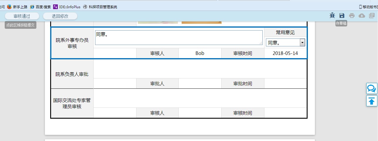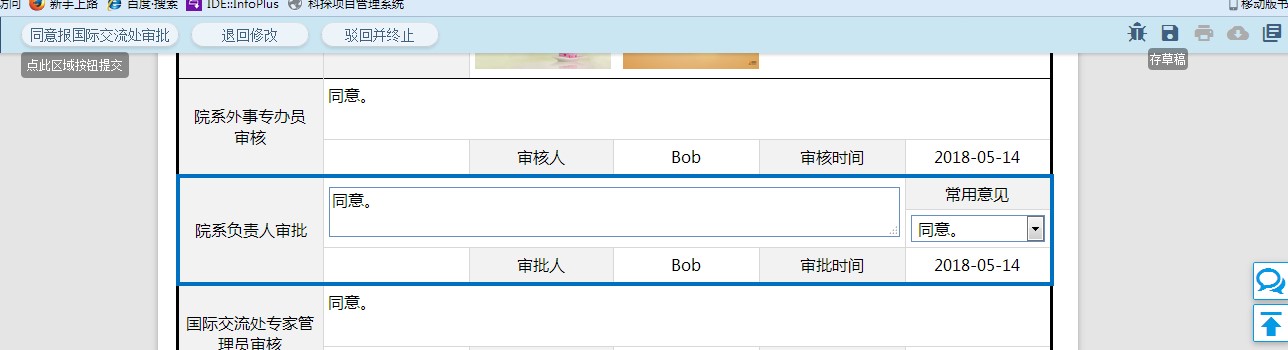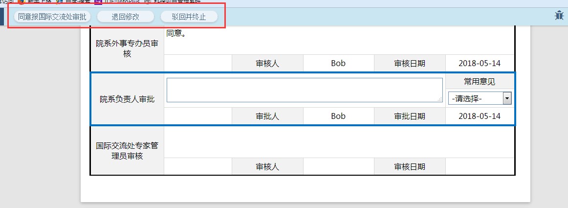 5、院系外事专办员审核通过后进入院系负责人审批环节,如图所示,院系负责人可根据申请情况来操作,点击“同意报国际交流处审批”按钮,则审批通过,进入下一步,国际交流处专家管理员审核。