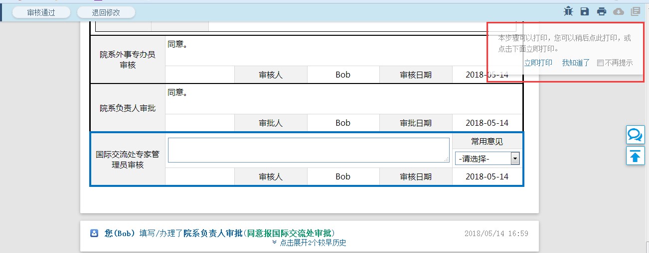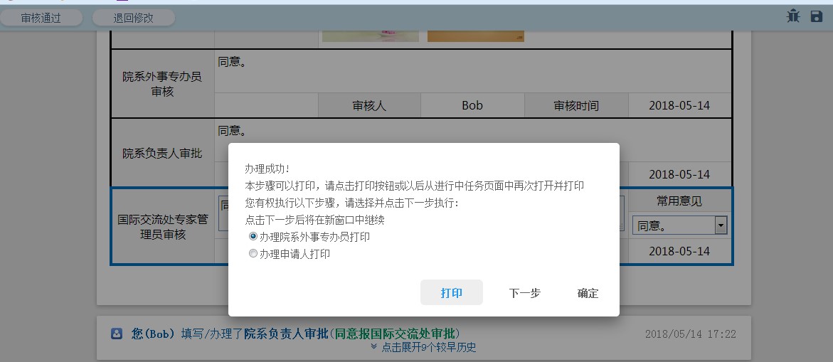 11、国际交流处专家管理员审核通过后,院系外事专办员与申请人打印表单后则次流程结束,如下图: