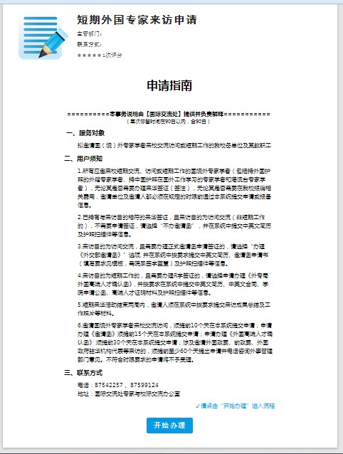 1、进入办事大厅打开“短期外国专家来访申请流程”,进入流程欢迎页。