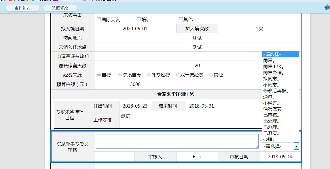 8、申请人填写好后点击“提交”按钮,进入下一步,院系外事专办员审核,对总结表进行审核,审核页面如下图: