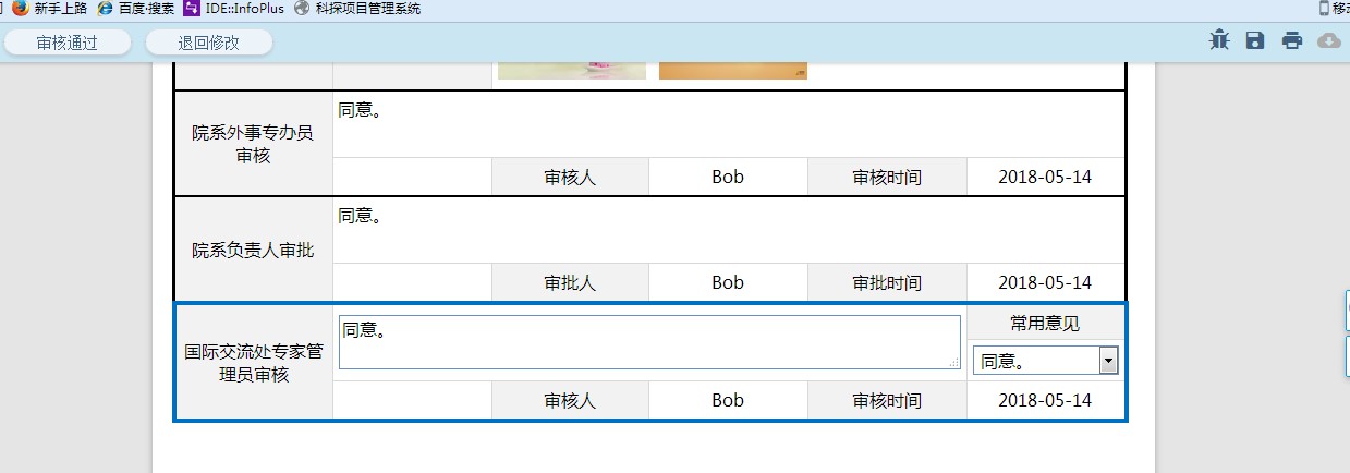 6、在国际交流处专家管理员审核环节的审批页面中,对申请信息进行审核,审核通过,则单击“审核通过”,如图所示,注意:此步骤可以打印表单。