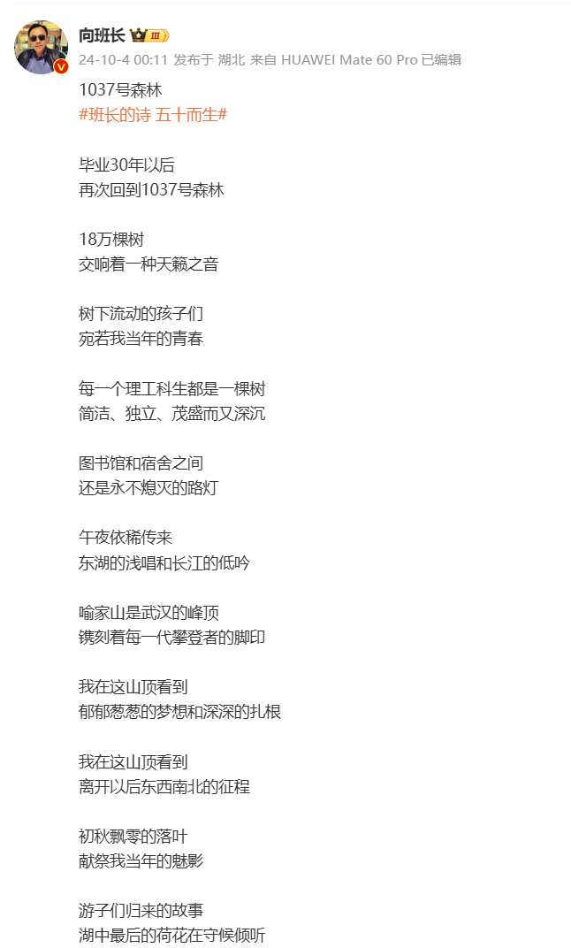 校园里,校友们一同参观了院史馆、体验了学校食堂,在操场上进行足球比赛,在学院大楼拍摄集体合影照,再一次攀登喻家山……正如校友代表903班“向班长”在自己的微博上写下的动人诗篇一样,90级校友们在这个金秋十月再次回到1037号森林谱写下新的动人故事。
