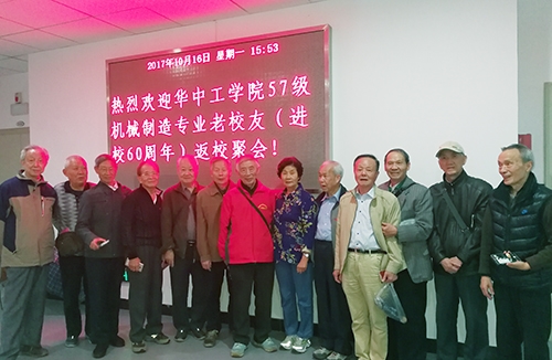 10月16日下午,华中工学院57级机械制造专业老校友欢聚一堂,庆祝进校60周年,他们共忆当年的青春岁月、同学情谊,寄语母校发展。