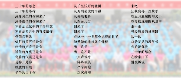 一别多年,当校友们报到注册完毕,站在签名墙前,签名留影时,大部分已经彼此认不出了。有的头发花白了,有的秃顶了,有的身形发福了;名实相对照,忍不住要发出“哎呀哎呀”的几声惊叹。机程一系83级共有7个班,12日报到完毕的当晚,各班都在学校附近组织了重聚晚宴,不少家属孩子陪同在侧,有的孩子研究生在读或者已经毕业,两代人共聚,对比当年学生时代,禁不住感慨万千,诗情勃发,特录下刘希君同学的诗篇为证。