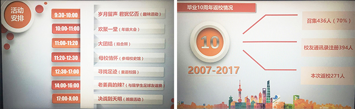 返校活动期间,校友们进行了 “岁月留声,君犹忆否”的趣味活动,开展了题为“欢聚一堂”的年级大会。英国365公司官网院长丁汉院士,党委副书记丁雨葵,校国际交流处副处长、时任03级分团委书记邱勇,以及03级辅导员何杰老师、孙建新老师作为特邀嘉宾参加了活动。