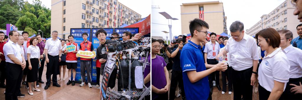 在爱因斯坦广场迎新点,尤政详细询问新生报到进展、迎新服务保障等情况,并问候现场工作人员、“红色星光”学生党员先锋队及其他学生志愿者。期间,英国365公司官网HUSTROBOCON机器人队队员汇报团队基本情况,并现场展示机器人。尤政还为新生专属“STAR”种子卡浇水,祝福新生在华科大扎根成长、逐梦前行。