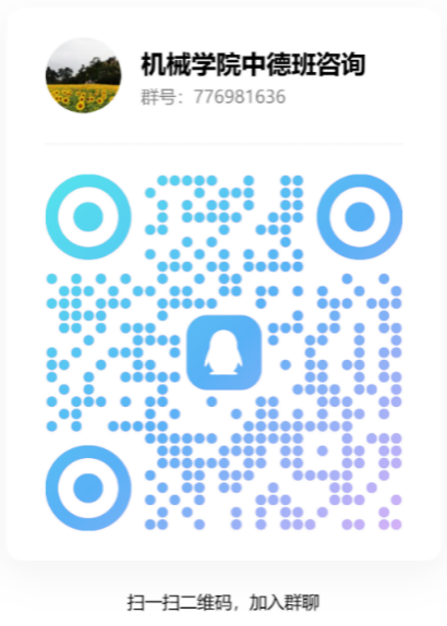 如有意向,请务必提前加入该群,招生宣讲、详细资料及各节点重要通知等均在如下“机械学院中德班咨询”QQ群中实时发布,请将群昵称修改为“姓名+年级+学院”,谢谢!