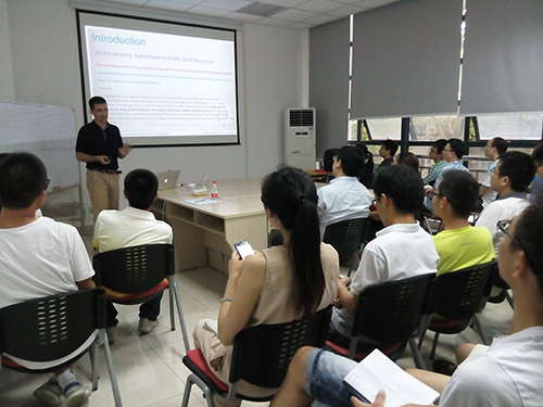 在第一场报告中,Ruben教授首先详细阐述了写作研究论文的重要性,同时与大家分享了写作过程中的技巧。在第二场学术报告中,Ruben教授着重介绍了他课题组的最新研究成果,即采用改进的贪婪迭代算法优化流水车间的调度问题,并且已经取得了显著性结果。在第三场报告中,Ruben教授为大家讲解了数据处理在科研工作中重要性,并当场演示了如何对比数据以及检测显著性结果。