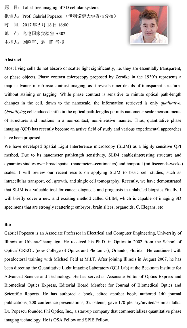 05.18 04:00PM 美国伊利诺伊大学香槟分校Gabriel Popescu教授学术报告