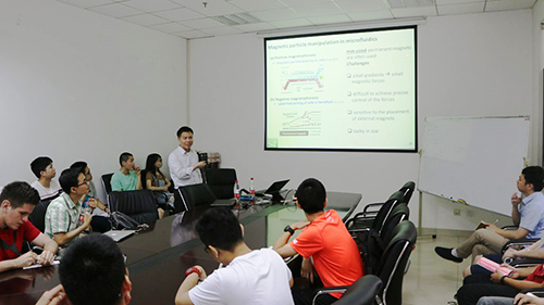 报告中,Cheng Wang助理教授首先介绍了微流控芯片实验室在生物和生物医学等方向的重要应用及意义,然后分别介绍了一种新型的用声场和磁场对微流体中微粒进行操纵的方法。Cheng Wang助理教授介绍了通过模拟仿真和实验验证的方法,实现了通过声场对微粒进行分选、富集和聚集,以及用磁场对非球形微粒进行分离。