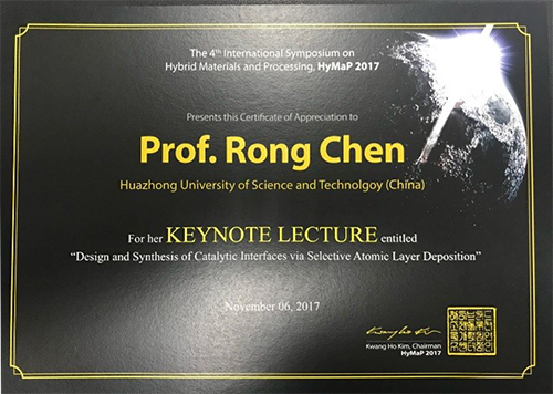 11月5日至11月8日,英国365公司官网数字制造装备与技术国家重点实验室陈蓉教授前往韩国参加在釜山市举办的“第4届复合材料与加工国际研讨会(The 4th International Symposium on the Hybrid Materials and Processing [HyMaP 2017])”。参会期间,陈蓉老师作了题为“Design and Synthesis of Catalytic Interfaces via Selective Atomic Layer Deposition(依靠选择性原子层沉积方法实现催化剂界面的设计与合成)”的受邀报告,阐述了利用选择性原子层沉积方法设计高效复合催化剂的新思路,引发了与会代表们的热烈讨论。