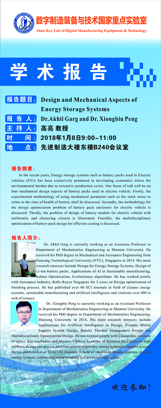 01.08 09:00AM 汕头大学副教授Akhil Garg、助理教授彭雄斌学术报告